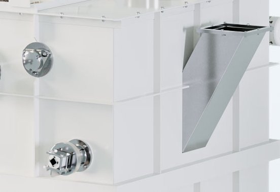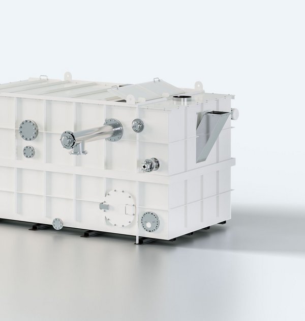 - Design: Rechteckiger Behälter mit geschlitztem Sieb über dem Ölstand. Eine zirkulierende Schubkette transportiert die abgesetzten Trubstoffe, die über eine Förderschnecke ausgetragen werden.